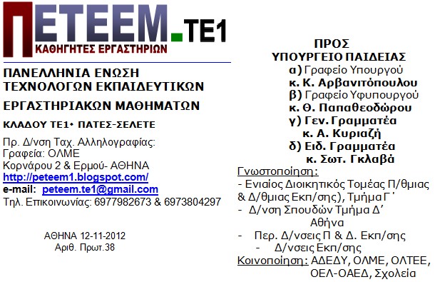 ΓΙΑ ΤΟ ΔΙΟΙΚΗΤΙΚΟ ΣΥΜΒΟΥΛΙΟ ΤΗΣ ΠΕΤΕΕΜ – ΚΛΑΔΟΥ ΤΕ01