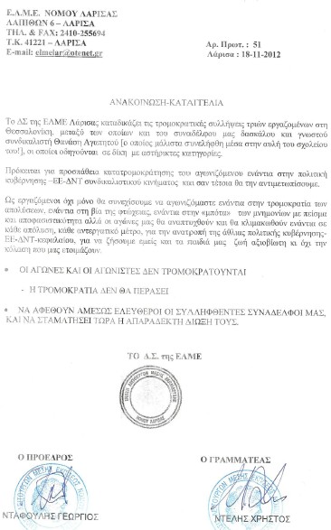 ΕΛΜΕ Λάρισας: Ανακοίνωση καταγγελία