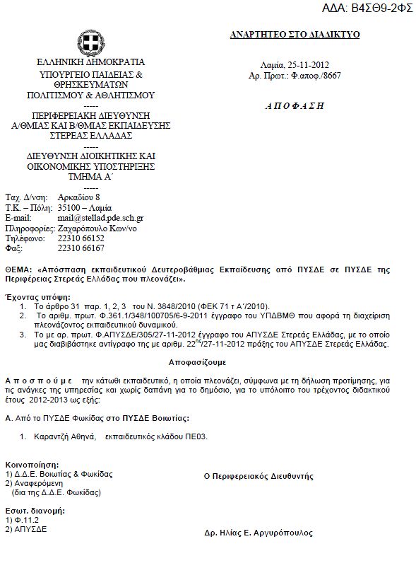 Απόσπαση εκπαιδευτικού ΔΕ από ΠΥΣΔΕ σε ΠΥΣΔΕ της Περιφέρειας Στερεάς Ελλάδας που πλεονάζει