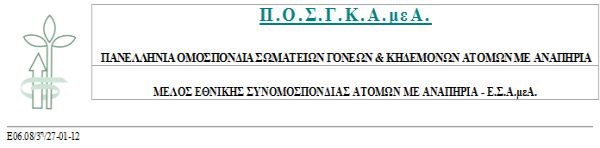 Η ΠΟΣΓΚΑμεΑ καλεί όλα τα Άτομα με Νοητική Αναπηρία, Αυτισμό, Σύνδρομο Down, Εγκεφαλική Παράλυση, Βαριές και Πολλαπλές Αναπηρία, όλους τους γονείς και τις οικογένειές τους, τα Άτομα και τους φορείς που εκπροσωπούν τα Άτομα με Αναπηρία, Χρόνιες Παθήσεις και τις οικογένειές τους, κάθε εργαζόμενο των δομών υγείας-πρόνοιας-αποκατάστασης-ψυχικής υγείας και κάθε Ελληνίδα και κάθε Έλληνα, την 3η Δεκέμβρη 2012 ημέρα Δευτέρα και ώρα 10:00 το πρωί, έξω από το Υπουργείο Υγείας, στην οδό Αριστοτέλους 17 για να διεκδικήσουμε ΟΛΟΙ ΜΑΖΙ το ΑΥΤΟΝΟΗΤΟ, την αξιοπρέπεια και την προστασία, των ανθρωπίνων και κοινωνικών δικαιωμάτων των Ατόμων με Αναπηρία και των οικογενειών τους στη χώρα μας!