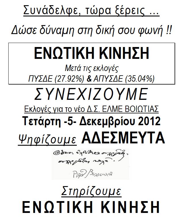 Ενωτική Κίνηση ΔΕ Βοιωτίας: Εκλογές για νέο ΔΣ 5/12