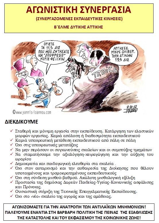 Η μείωση των δαπανών και της χρηματοδότησης των σχολικών επιτροπών δεν αποτελούν όμως το μόνο τίμημα που καλείται να πληρώσει η παιδεία στις συνεχιζόμενες μνημονιακές πολιτικές.Η νέα χρονιά θα βρει τους εκπαιδευτικούς με μειώσεις έως 50% στις αποδοχές τους σε σχέση με πέρυσι, και ιδιαίτερα τους νέους με αποδοχές στα 600 ευρώ να αδυνατούν ακόμα και να επιβιώσουν από το μισθό τους στις εσχατιές της χώρας. Ευτυχώς που το Υπουργείο Παιδείας προτίθεται να δώσει κουπόνι σίτισης σε νεοδιόριστους δασκάλους και καθηγητές! Παράλληλα, οι χιλιάδες αδιόριστοι εκπαιδευτικοί καταδικάζονται στην ανεργία, αφού οι προσλήψεις τους μειώνονται κατά 85% την επόμενη χρονιά! Για να αντιμετωπιστούν τα τεράστια προβλήματα το Υπουργείο επαναφέρει τα 30άρια τμήματα, θέλει να συγχωνεύσει 1500 σχολικές μονάδες και να αυξήσει από τη νέα σχολική χρονιά το ωράριο των καθηγητών! Τα στοιχεία αυτά θα δημιουργήσουν τεχνητές υπεραριθμίες. Στο σημείο αυτό η τρόικα εσωτερικού ψήφισε ήδη τις υποχρεωτικές μεταθέσεις σε όλη την επικράτεια, μετατρέποντας τους εκπαιδευτικούς σε περιπλανώμενους φαντάρους διαλύοντας οικογένειες και εργασιακές σχέσεις! Το σχέδιο του Υπουργείου προβλέπει την μετακίνηση σε όλη την Ελλάδα 10000 συναδέλφων! Την ίδια στιγμή προωθείται εγκύκλιος με βάση την οποία οδηγούν σε αργία κάθε υπάλληλο, ακόμα και για την πολιτικοσυνδικαλιστική άποψη και δράση! Το πειθαρχικό δίκαιο «τυλίγει πολύ εύκολα σε μια κόλλα χαρτί» ανά πάσα στιγμή κάθε συνάδελφο που δεν είναι απόλυτα υποταγμένος! Ο καθηγητής που κατηγορείται για «ανάρμοστη συμπεριφορά» ή για «σοβαρή απείθεια» και οδηγείται σε ΕΔΕ τίθεται σε αργία! Οι απολύσεις θα συνεχιστούν με την αξιολόγηση-χειραγώγηση που θα δείξει σε κάποιους ή κάποιες το δρόμο προς την έξοδο από την εκπαιδευτική διαδικασία, όχι επειδή δεν κάνουν καλά τη δουλειά τους, αλλά επειδή έτσι απαιτούν οι δανειστές της χώρας. Όσοι τελικά απομείνουν θα πρέπει συνεπώς να είναι πλήρως υπάκουοι και χειραγωγημένοι, πειθήνια όργανα στις εντολές για την εφαρμογή των αντιλαϊκών επιλογών που οδηγούν στο σχολείο της αγοράς αλλά και στο τσάκισμα των εργασιακών μας δικαιωμάτων. Έτσι τη στιγμή που γίνεται λόγος για απολύσεις χιλιάδων εκπαιδευτικών το 2013 διαμορφώνεται ένα ασφυκτικό περιβάλλον εργασίας στα δημόσια σχολεία!