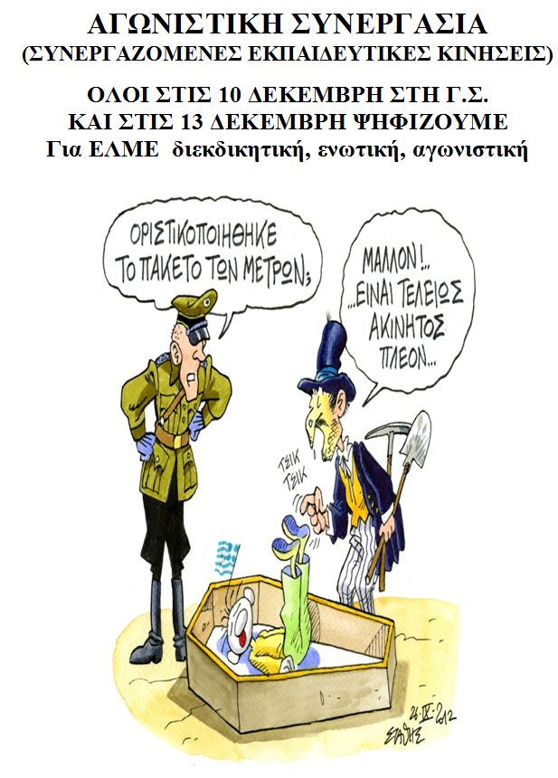Οι εκλογές της 13ης Δεκέμβρη θα πρέπει να στείλουν σαφέστατο μήνυμα καταδίκης των πολιτικών Κυβέρνησης-ΕΕ-ΔΝΤ που διαλύουν τις ζωές μας. Η ανατροπή των μέτρων και των μνημονίων, καθώς και της τρικομματικής κυβέρνησης που τα προωθεί, είναι όχι μόνο θέμα πρώτης προτεραιότητας αλλά και όρος επιβίωσης για όλους και όλες μας. Χρειάζεται σκληρός αγώνας και οργανωμένο κίνημα μέσα στα σωματεία για να μπλοκάρουμε στην πράξη τα βάρβαρα μέτρα! Τώρα που η βαρβαρότητα μας έχει περικυκλώσει δεν έχουμε άλλη επιλογή από τη ρήξη!