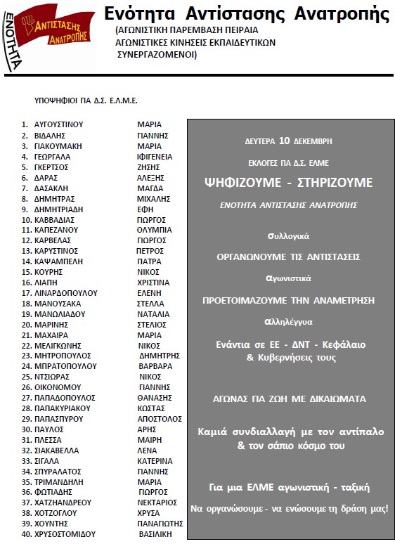 Μπροστά σε αυτή την κατάσταση, η Αγωνιστική Παρέμβαση Πειραιά και οι Αγωνιστικές Κινήσεις Εκπ/κών αποφασίσαμε να συγκροτήσουμε στην ΕΛΜΕ Πειραιά την Ενότητα Αντίστασης Ανατροπής, μια απόπειρα μεγαλύτερης συγκέντρωσης δυνάμεων, που θα προσπαθήσουν να συμβάλουν από καλύτερες θέσεις στο καθήκον της συγκρότησης των αντιστάσεων των εργαζομένων και της αναγκαίας ανασυγκρότησης του σωματείου.