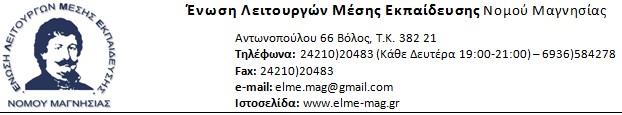 Τετάρτη, 12 Δεκεμβρίου 2012 Αρ. Πρωτ. 096 Προς · Σχολεία και Υπηρεσίες της Διεύθυνσης Δευτεροβάθμιας Εκπαίδευσης Νομού Μαγνησίας · ΜΜΕ Θέμα: « ”Οδηγία” του Διευθυντή Δευτεροβάθμιας Εκπαίδευσης για τις καταλήψεις » Ο Διευθυντής Δευτεροβάθμιας Εκπαίδευσης με έγγραφο - «οδηγία» του, προς τα σχολεία, υπενθυμίζει εγκύκλιο του ‘85 του τότε ΥΠΕΠΘ. Σύμφωνα με αυτή, κατά την διάρκεια της κατάληψης σχολείου οι «καταληψίες» θεωρούνται αδικαιολογήτως απόντες και ενώ όσοι μαθητές με οιονδήποτε τρόπο δηλώνουν «εμμονή στις μαθητικές τους υποχρεώσεις και δεν έλαβαν μέρος στην κατάληψη» θεωρούνται δικαιολογημένα παρόντες. Η εγκύκλιος στηρίχτηκε σε γνωμοδότηση του Νομικού Συμβουλίου του Κράτους το ‘ 85 την οποία αποδέχτηκε ο τότε υπουργός Παιδείας. Η «οδηγία» προβλημάτισε πολλούς Διευθυντές και Συλλόγους Εκπαιδευτικών. Οι προβληματισμοί εκφράστηκαν και στην προχθεσινή συνάντηση των Διευθυντών Σχολικών Μονάδων του Νομού αλλά μάταια αφού δε δόθηκε καμία σαφής απάντηση από το Διευθυντή Δευτεροβάθμιας Εκπαίδευσης. Προτού μπούμε στη διαδικασία σχολιασμού της εγκυκλίου και με δεδομένο το ότι οι γνωμοδοτήσεις του Νομικού Συμβουλίου του Κράτους δεν έχουν δεσμευτικό χαρακτήρα για την πολιτική ηγεσία, θέτουμε δημόσια κάποιες διευκρινιστικές ερωτήσεις στο Διευθυντή της Δευτεροβάθμιας Εκπαίδευσης: 1. Το συγκεκριμένο έγγραφο που απέστειλε στους Διευθυντές και τους Συλλόγους των Εκπαιδευτικών είναι γενική κατεύθυνση και του νυν υπουργού Παιδείας, συνάδει με την ισχύουσα νομοθεσία ή αποτελεί τοπική πρωτοβουλία του Διευθυντή Εκπαίδευσης που αποφάσισε να αποδεχθεί τη συγκεκριμένη γνωμοδότηση; 2. Οι μεταγενέστερες νομοθετικές και διοικητικές ρυθμίσεις που αφορούν καταλήψεις σχολείων από μαθητές και που προσδιορίζουν επακριβώς διαδικασία αναπλήρωσης μαθημάτων για τις μέρες κατάληψης ισχύουν ή όχι; 3. Έστω ότι εφαρμόζεται η εγκύκλιος και με τον α ή β τρόπο ένας μαθητής δήλωσε παρουσία σε μέρα κατάληψης. Σε περίπτωση αναπλήρωσης των μαθημάτων αυτής της μέρας ο μαθητής θα πρέπει να παρακολουθήσει τα μαθήματα της αναπλήρωσης ή όχι; 4. Σύμφωνα με την «οδηγία», σε σχολεία που μέχρι σήμερα έχουν υπερβεί τις 8-9 μέρες κατάληψης, οι μαθητές τους έχουν υπερβεί το όριο των αδικαιολογήτων απουσιών και κατά συνέπεια η φοίτησή τους κρίνεται ανεπαρκής. Έτσι όλοι οι μαθητές πρέπει να επαναλάβουν την τάξη. Με δεδομένο ότι ο σύλλογος καθηγητών στο τέλος του έτους κρίνει τη φοίτηση, τι εισηγείστε; Επιμένετε να εφαρμοστεί η συγκεκριμένη εγκύκλιος; Το ΔΣ της ΕΛΜΕ Μαγνησίας αναφορικά στην κάλυψη των απολεσθεισών ωρών από καταλήψεις: · Καλεί τους Διευθυντές και τους Εκπαιδευτικούς των Συλλόγων Διδασκόντων να ενεργήσουν, όπως κάθε φορά, με γνώμονα το μέγιστο εκπαιδευτικό και παιδαγωγικό όφελος των μαθητών τους. · Ενημερώνει τους Διευθυντές και Εκπαιδευτικούς των Σχολείων ότι η ούτως ή άλλως ανεφάρμοστη «Οδηγία» είναι ασύμβατη με τις σύγχρονες νομικές και παιδαγωγικές κατευθύνσεις, αφού η ισχύουσα νομοθεσία και κυρίως οι ορθές παιδαγωγικές πρακτικές προβλέπουν την αναπλήρωση των απολεσθεισών ωρών και όχι την «τιμωρία» των μαθητών με απουσίες. · Προτείνει τη συνεργασία με τα υπόλοιπα μέλη της Σχολικής Κοινότητας (μαθητές και γονείς) ώστε να βρεθεί η προσφορότερη λύση, για κάθε σχολείο, με σκοπό την κάλυψη της διδακτέας ύλης χωρίς να διαταραχθεί το παιδαγωγικά κλίμα κ