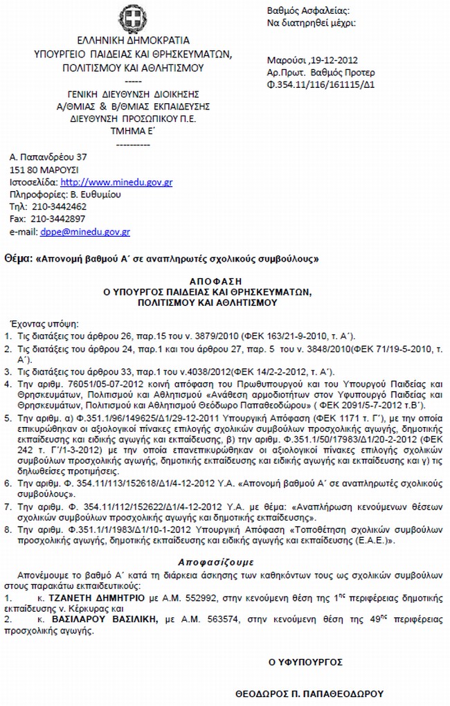 Απονομή βαθμού Α' σε αναπληρωτές σχολικούς συμβούλους