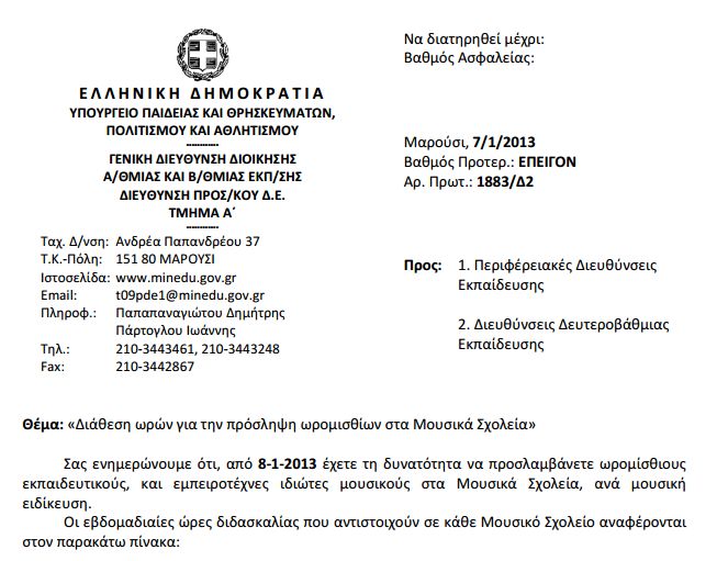 Διάθεση ωρών για την πρόσληψη ωρομισθίων στα Μουσικά Σχολεία