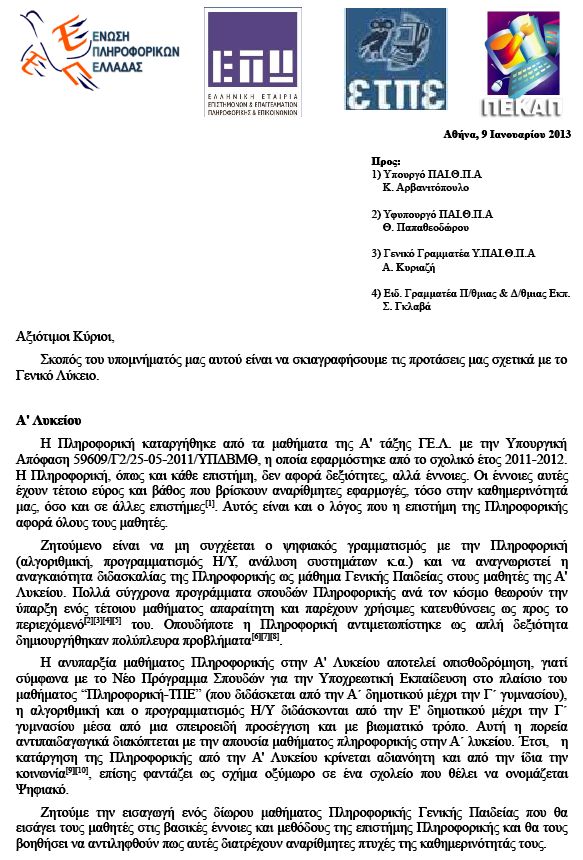Προτάσεις φορέων πληροφορικής για το "Γενικό Λύκειο"