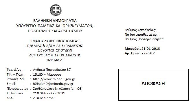 7. Τις διατάξεις της υπ’ αριθμ. 76051/Η/04-07-2012 κοινής απόφασης του Πρωθυπουργού και του Υπουργού Παιδείας και Θρησκευμάτων, Πολιτισμού και Αθλητισμού με θέμα: «Ανάθεση αρμοδιοτήτων στον Υφυπουργό Παιδείας και Θρησκευμάτων, Πολιτισμού και Αθλητισμού Θεόδωρο Παπαθεοδώρου» (ΦΕΚ 2091 Β΄).