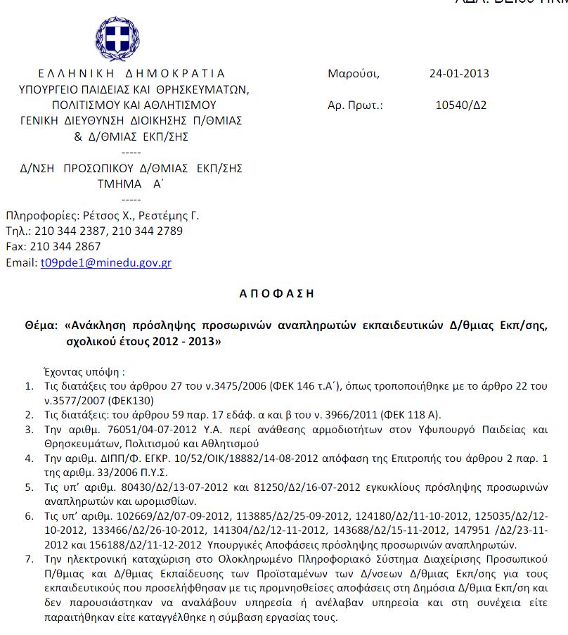 Ανάκληση πρόσληψης προσωρινών αναπληρωτών εκπαιδευτικών ΔΕ