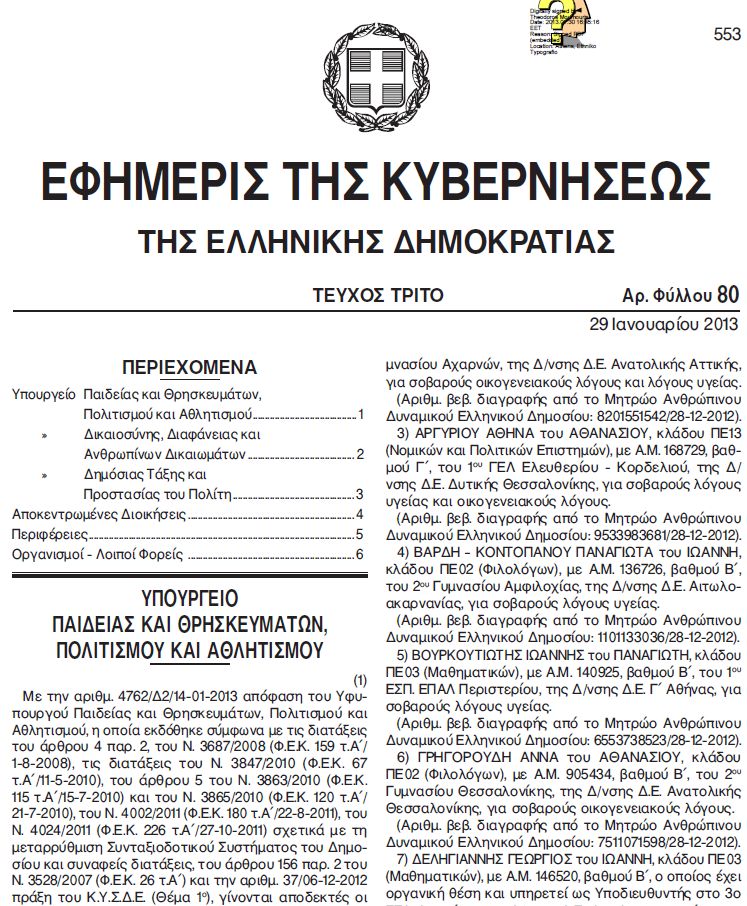 31 παραιτήσεις εκπαιδευτικών ΔΕ (μέσω ΚΥΣΔΕ για σοβαρούς οικογενειακούς λόγους ή και λόγους υγείας) στο ΦΕΚ 80Γ/2013
