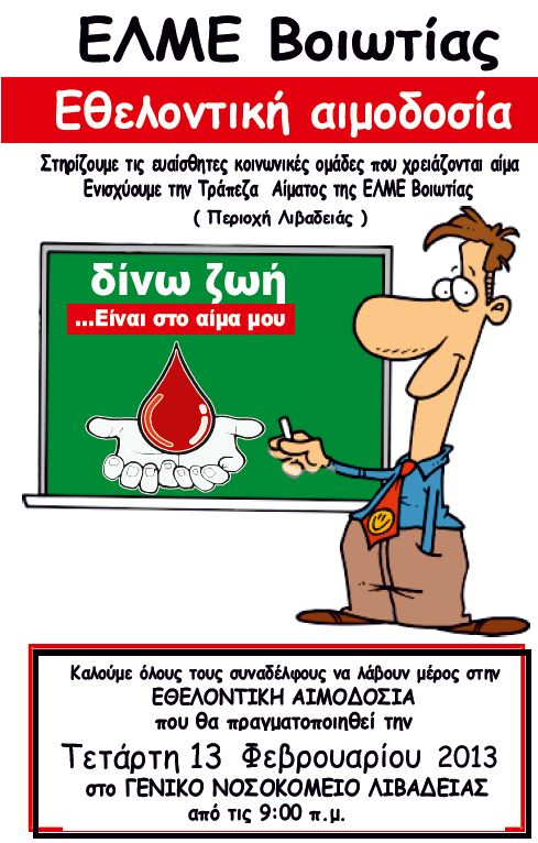 Εθελοντική αιμοδοσία 13/2 από την ΕΛΜΕ Βοιωτίας