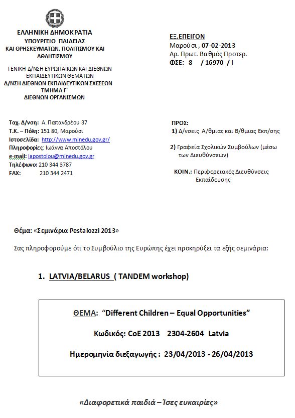 Προκήρυξη σεμιναρίων Pestalozzi 2013 - ΛΕΤΟΝΙΑ / ΙΣΠΑΝΙΑ
