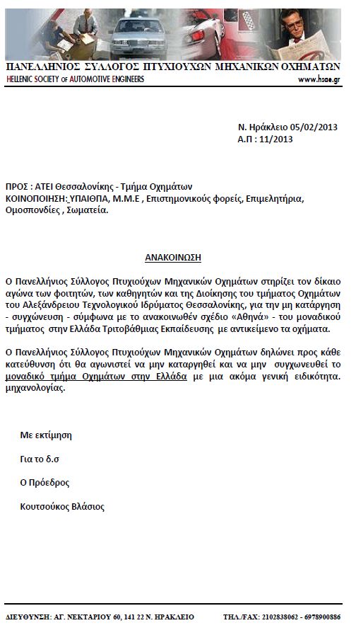 Ο Πανελλήνιος Σύλλογος Πτυχιούχων Μηχανικών Οχημάτων στηρίζει τον δίκαιο αγώνα των φοιτητών, των καθηγητών και της Διοίκησης του τμήματος Οχημάτων του Αλεξάνδρειου Τεχνολογικού Ιδρύματος Θεσσαλονίκης, για την μη κατάργηση - συγχώνευση - σύμφωνα με το ανακοινωθέν σχέδιο «Αθηνά» - του μοναδικού τμήματος στην Ελλάδα Τριτοβάθμιας Εκπαίδευσης με αντικείμενο τα οχήματα.
