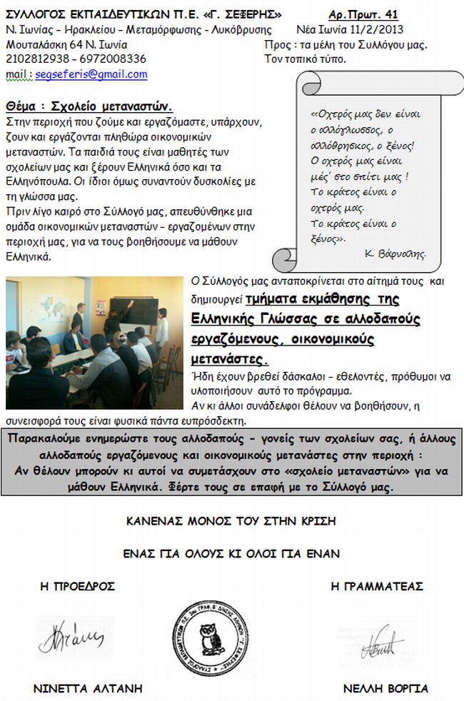 Τμήματα εκμάθησης Ελληνικής Γλώσσας σε αλλοδαπούς εργαζόμενους, οικονομικούς μετανάστες
