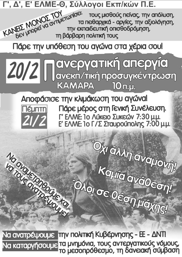Όλοι στην απεργία 20/2 - πανεκπαιδευτική προσυγκέντρωση 10.00 π.μ. - Καμάρα