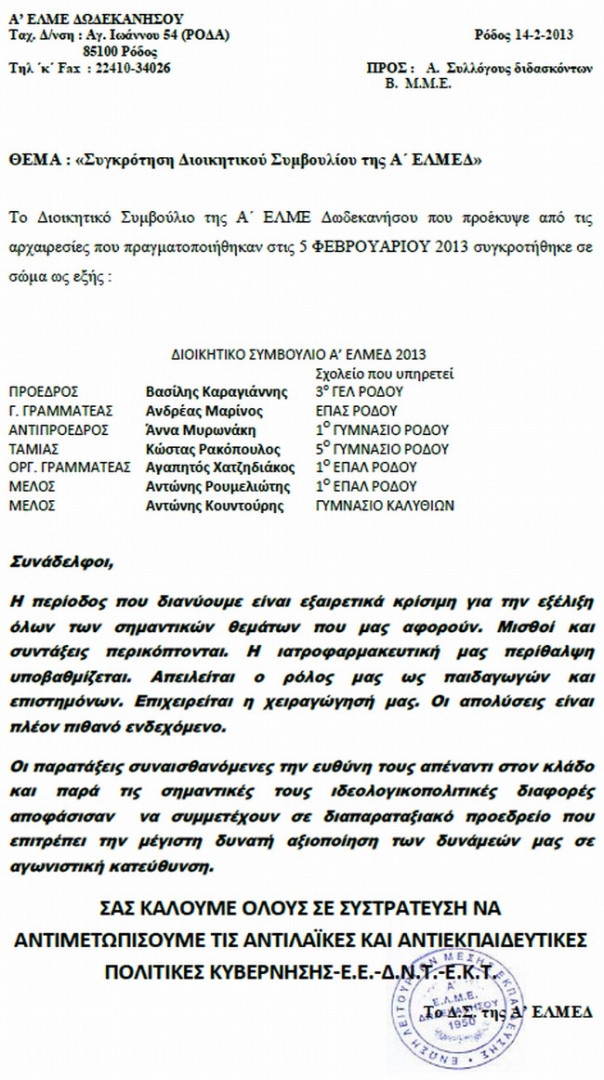 Α ΕΛΜΕ Δωδεκανήσου: Συγκρότηση ΔΣ