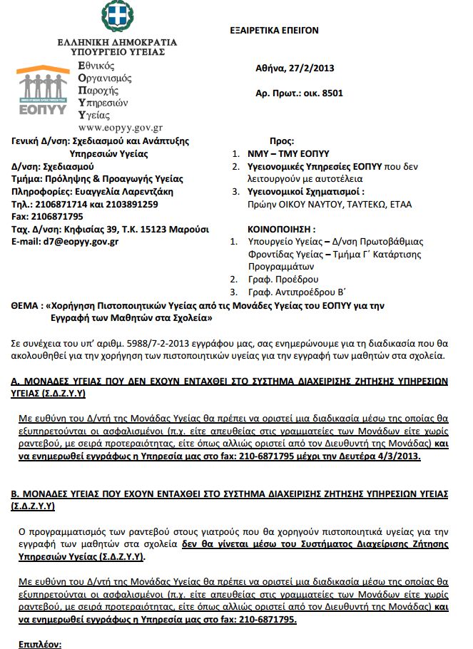 Τα πιστοποιητικά για την Εγγραφή των Μαθητών στα Σχολεία