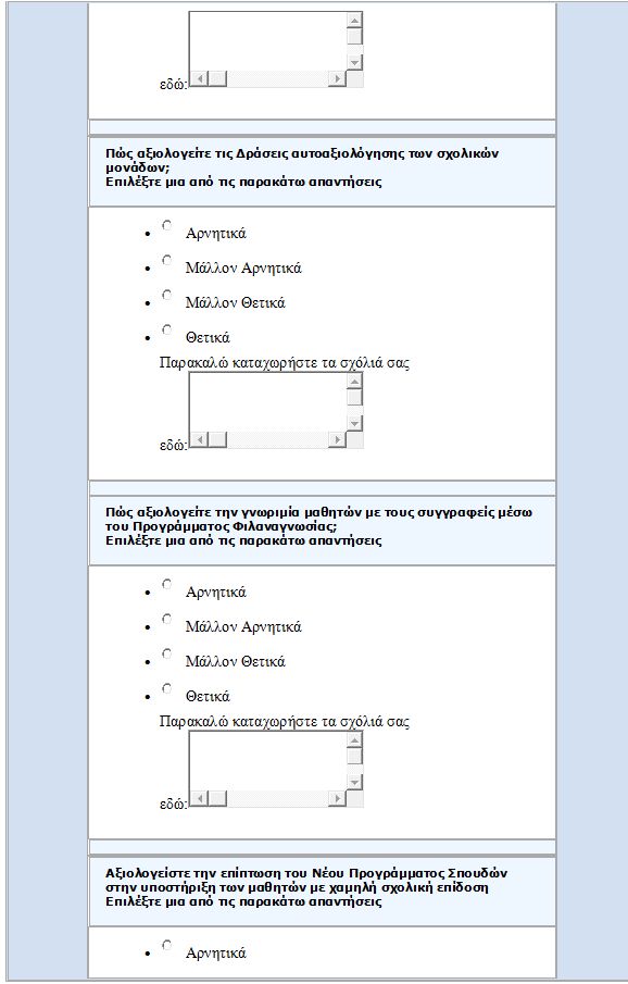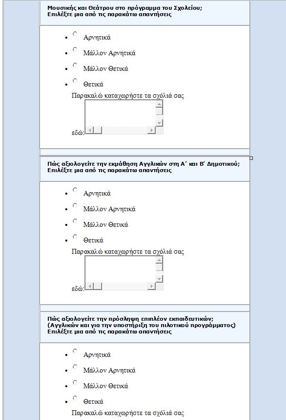 · Καλούμε διευθυντές, συλλόγους διδασκόντων, συλλόγους γονέων, να αρνηθούν να εμπαίζονται κατ’ επανάληψη και να υπογράφουν προειλημμένες αποφάσεις, σε βάρος μάλιστα, των μορφωτικών δικαιωμάτων των μαθητών. Τους καλούμε να μη συμπληρώσουν τα ερωτηματολόγια και παρέχουμε πλήρη συνδικαλιστική κάλυψη γι’ αυτό. Να ξεκαθαρίσουμε ότι δεν προκύπτει από πουθενά ότι είναι υποχρεωτική η συμπλήρωση του ερωτηματολογίου.