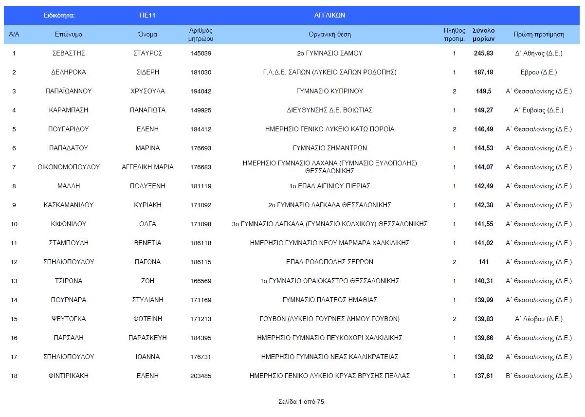Πίνακες μορίων μετάθεσης εκπαιδευτικών ΠΕ06 αγγλικών