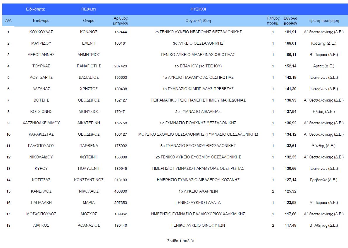 Πίνακες μορίων μετάθεσης εκπαιδευτικών ΠΕ04.01 Φυσικών