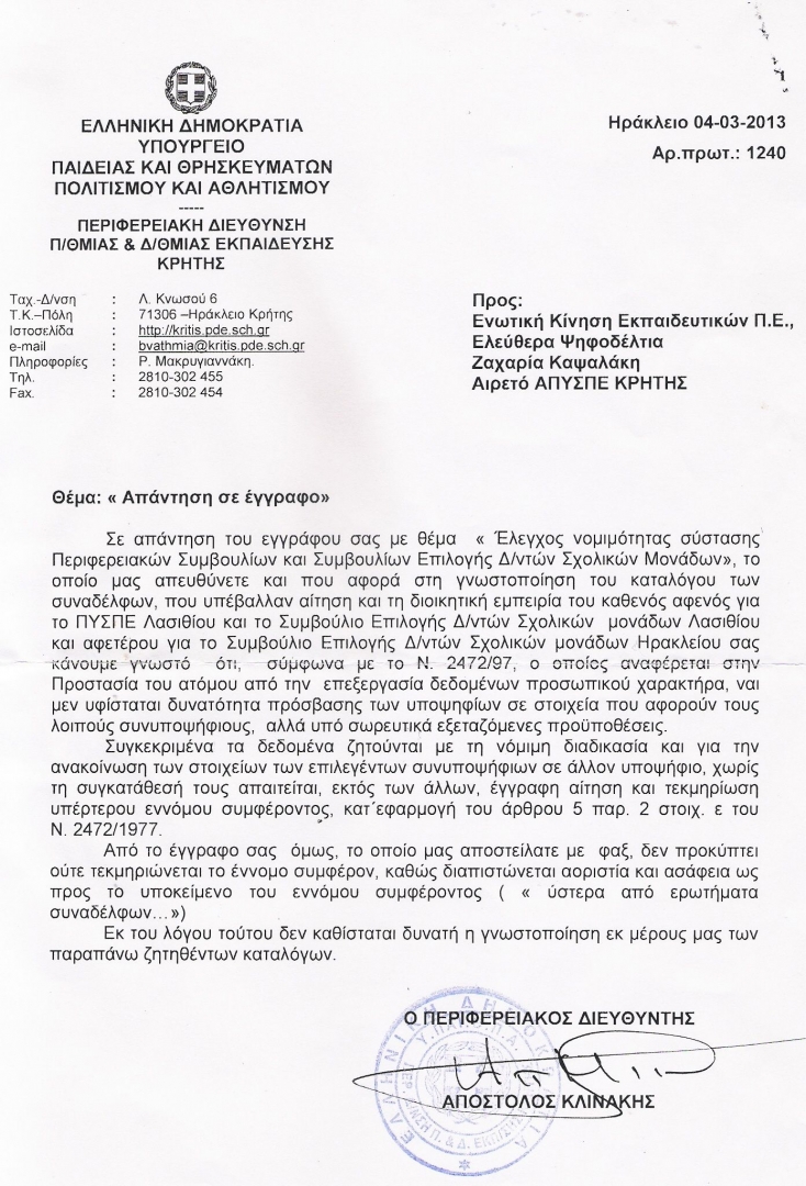 Ως αιρετός του ΑΠΥΣΠΕ Κρήτης και εκπροσωπώντας την ΕΝΩΤΙΚΗ ΚΙΝΗΣΗ ΕΚΠΑΙΔΕΥΤΙΚΩΝ Π.Ε. – ΕΛΕΥΘΕΡΑ ΨΗΦΟΔΕΛΤΙΑ, κατέθεσα στα μέσα του Φλεβάρη στο Περιφερειακό Διευθυντή Εκπαίδευσης Κρήτης κ. Απόστολο Κλινάκη, το παρακάτω κείμενο: