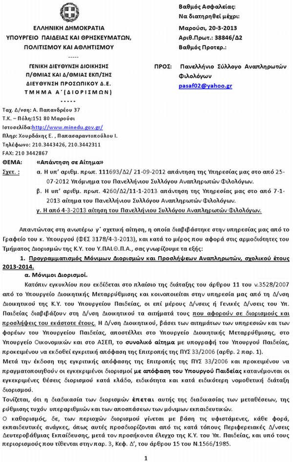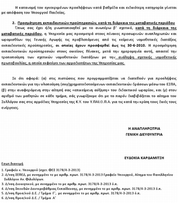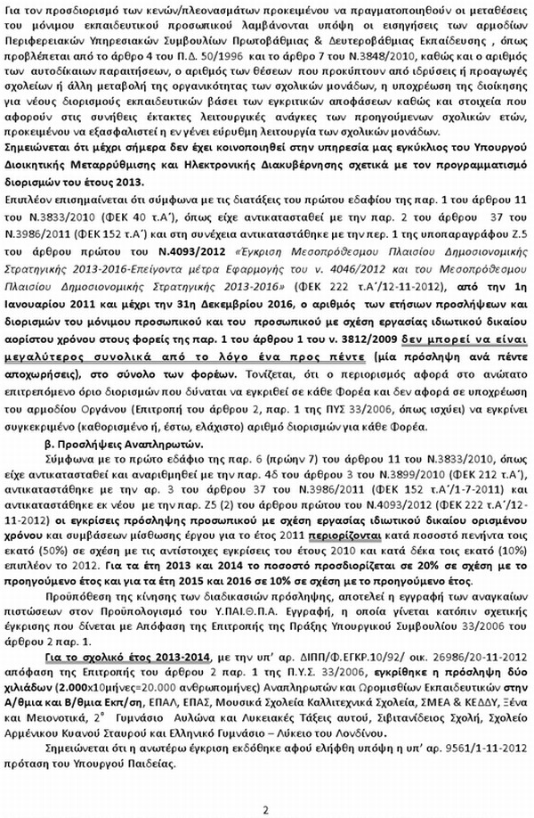 Σε έγγραφο του υπουργείου Παιδείας φαίνεται ο προγραμματισμός μόνιμων διορισμών και προσλήψεων αναπληρωτών για το σχολικό έτος 2013 - 2014. Η διαδικασία των διορισμών έπεται της διαδικασίας των μεταθέσεων, της ρύθμισης τυχόν υπεραριθμιών και των αποσπάσεων των μόνιμων εκπαιδευτικών. Για το σχολικό έτος 2013-2014 εγκρίθηκε η πρόσληψη μόνο 2.000 αναπληρωτών και ωρομισθίων εκπαιδευτικών στην πρωτοβάθμια και δευτεροβάθμια εκπαίδευση. Όσον αφορά στην προσμέτρηση εκπαιδευτικών προϋπηρεσιών το υπουργείο Παιδείας απαντά ότι απαιτείται τροποποίηση της νομοθεσίας.
