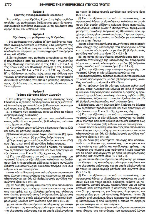 Ο τρόπος αξιολόγησης των μαθημάτων της Νεοελληνικής Γλώσσας, Νεοελληνικής Λογοτεχνίας και Αρχαίας Ελληνικής Γλώσσας και Γραμματείας αναφέρεται στο ΦΕΚ: