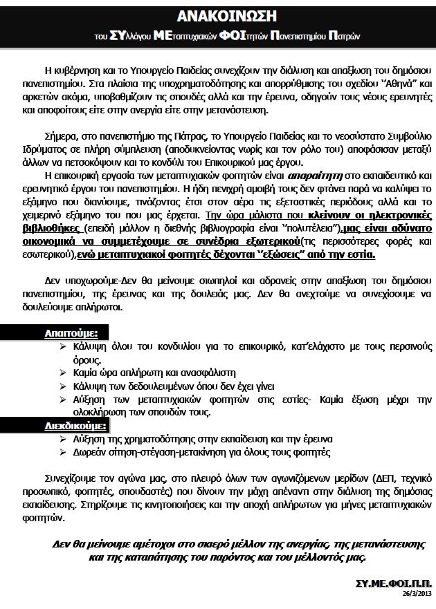 Ανακοίνωση για το σχέδιο "Αθηνά" του Συλλόγου μεταπτυχιακών φοιτητών πανεπιστημίου Πατρών