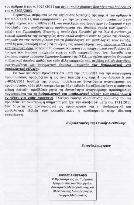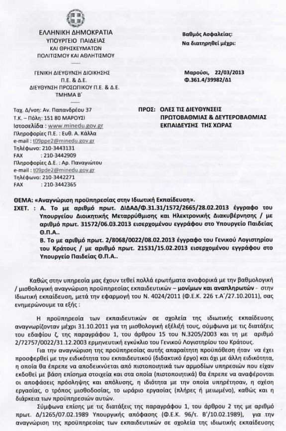 Υπ. Παιδείας: Αναγνώριση προϋπηρεσίας σύμφωνα με τις διατάξεις του άρθρου 6 του ν.4024/2011