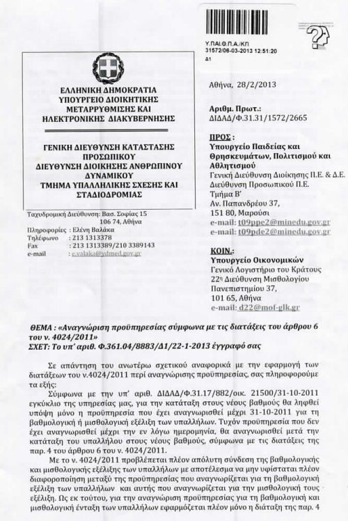 ΥΠΟΥΡΓΕΙΟ ΔΙΟΙΚΗΤΙΚΗΣ ΜΕΤΑΡΡΥΘΜΙΣΗΣ : Αναγνώριση προϋπηρεσίας σύμφωνα με τις διατάξεις του άρθρου 6 του ν.4024/2011