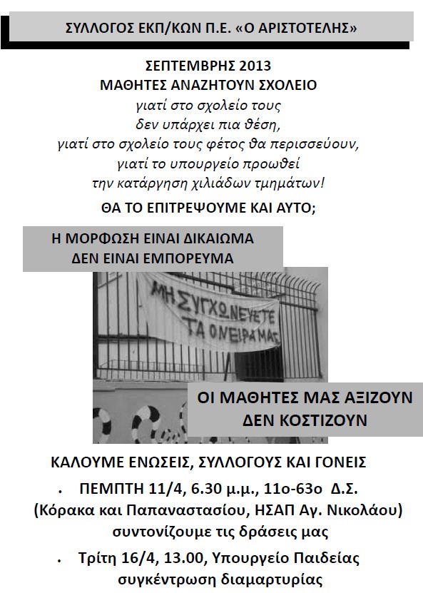 · συμμετοχή στη συγκέντρωση διαμαρτυρίας που διοργανώνουν οι σύλλογοι εκπαιδευτικών, έξω από το Υπουργείο (ΗΣΑΠ Νερατζιώτισσα), την Τρίτη 16/4 στις 13.00