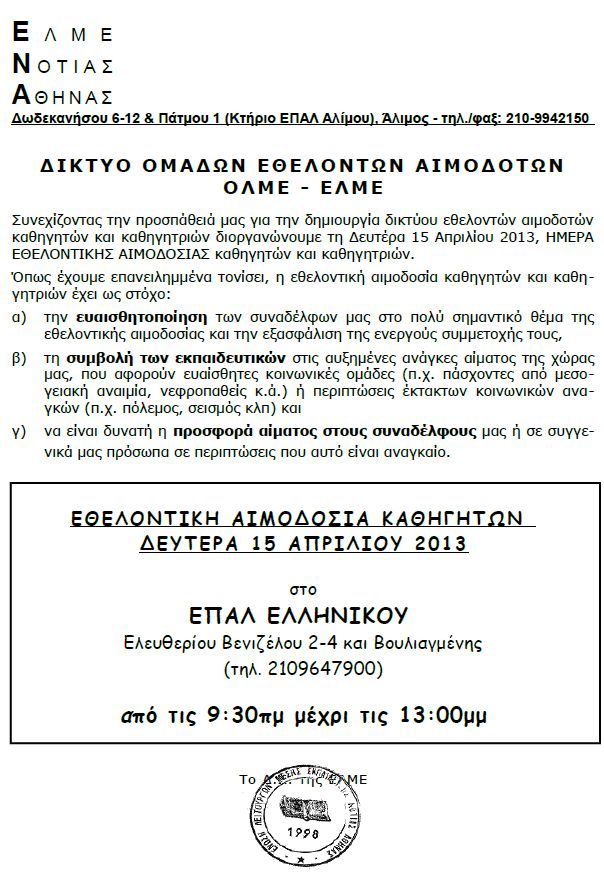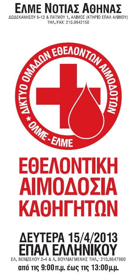 ΕΛΜΕ Νότιας Αθήνας: Ημέρα εθελοντικής αιμοδοσίας η Δευτέρα 15/4