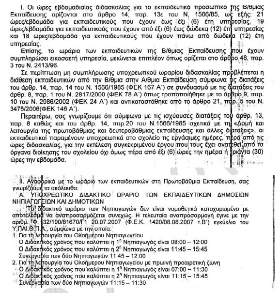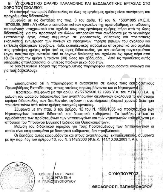 Διαβάστε παρακάτω το έγγραφο του Υφυπουργού Παιδείας Θεόδωρου Π. Παπαθεοδώρου σχετικά με το ωράριο των εκπαιδευτικών Πρωτοβάθμιας και Δευτεροβάθμιας Εκπαίδευσης.