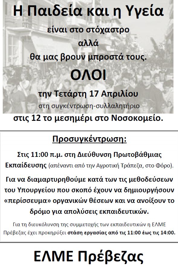 ΕΛΜΕ Πρέβεζας: Συγκέντρωση- συλλαλητήριο 17/4 για την παιδεία και την υγεία
