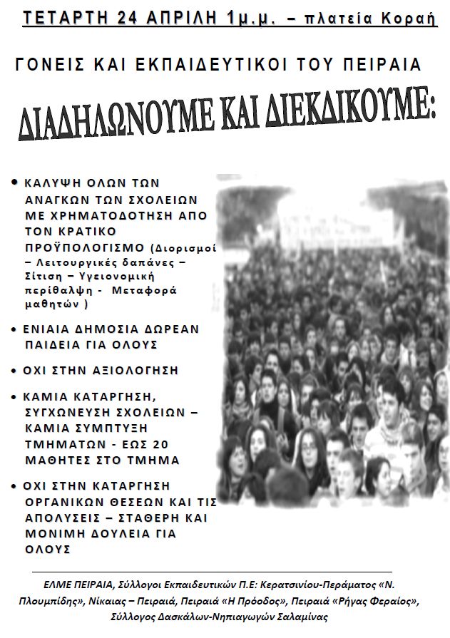 ΚΙΝΗΤΟΠOΙΗΣΗ ΕΚΠΑΙΔΕΥΤΙΚΩΝ- ΓΟΝΙΩΝ- ΜΑΘΗΤΩΝ ΤΗΝ ΤΕΤΑΡΤΗ 24 ΑΠΡΙΛΗ ΩΡΑ 13.00 (ΠΛΑΤΕΙΑ ΚΟΡΑΗ)