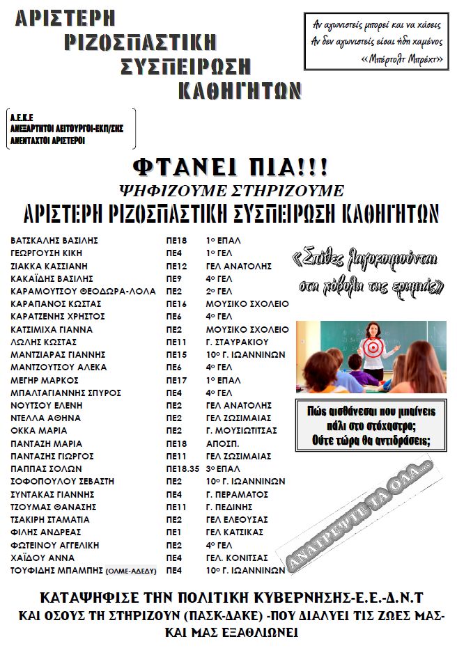 Αριστερή Ριζοσπαστική Συσπείρωση καθηγητών Ιωαννίνων: Ψηφοδέλτιο