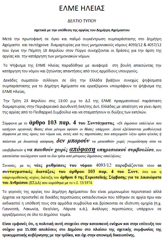 ΕΛΜΕ Ηλείας: Σχετικά με την υπόθεση της αργίας του Δημήτρη Αχείμαστου