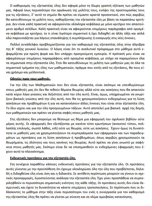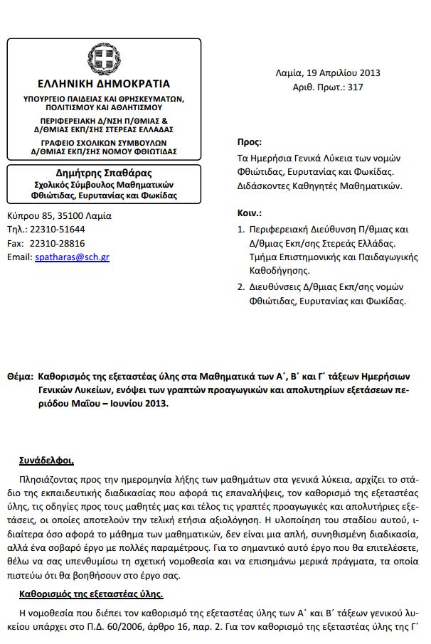 Καθορισμός της εξεταστέας ύλης στα Μαθηματικά των Α, Β και Γ τάξεων Ημερήσιων Λυκείων, ενόψει των γραπτών προαγωγικών και απολυτηρίων εξετάσεων περιόδου Μαΐου – Ιουνίου 2013.