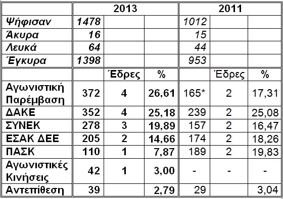 *Το 2011 η Αγωνιστική Παρέμβαση συμμετείχε στις εκλογές από κοινού με την Αγωνιστική Κίνηση