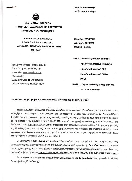 Πριν καν ψηφιστεί η αύξηση ζητούν στοιχεία από τα σχολεία μέχρι την Μ. Πέμπτη και από τις Διευθύνσεις μέχρι τη Παρασκευή του Πάσχα 10/05, με υπολογισμό της αύξησης των 2 ωρών!