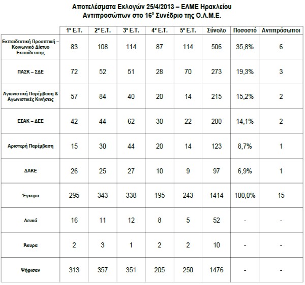 ΕΛΜΕ Ηρακλείου: Αποτελέσματα εκλογής αντιπροσώπων