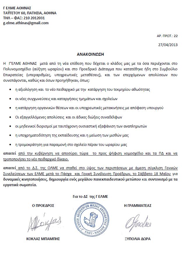 Γ ΕΛΜΕ Αθήνας: Να αποσυρθεί το νομοσχέδιο για το ΠΔ
