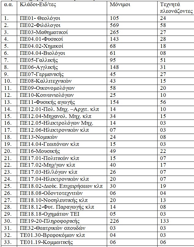 α) Έλλειμμα παρουσιάζεται στους ΠΕ04.03-Φυσ/στες (-1), ΤΕ01.19-Κομμωτικής (-6), και ΠΕ18.29-Φωτογραφίας (-1)!!!