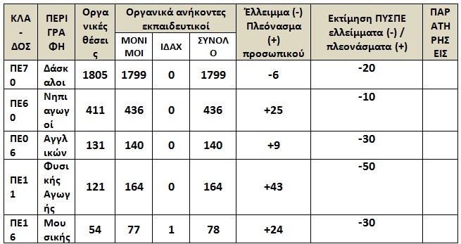 Σας κοινοποιώ τον πίνακα οργανικής σύνθεσης Διδακτικού προσωπικού όπως συντάχθηκε και στάλθηκε από τη Δ/νση Π. Ε. Β΄ Αθήνας στο ΥΠΑΙΘΠΑ (συνεδρίαση ΠΥΣΠΕ Β΄ Αθήνας της 22 – 5 – 2013, ο οποίος καταψηφίστηκε από τα αιρετά μέλη του ΠΥΣΠΕ, όπως σας ενημέρωσα με προηγούμενο ενημερωτικό δελτίο).