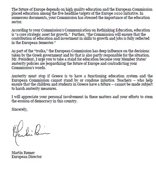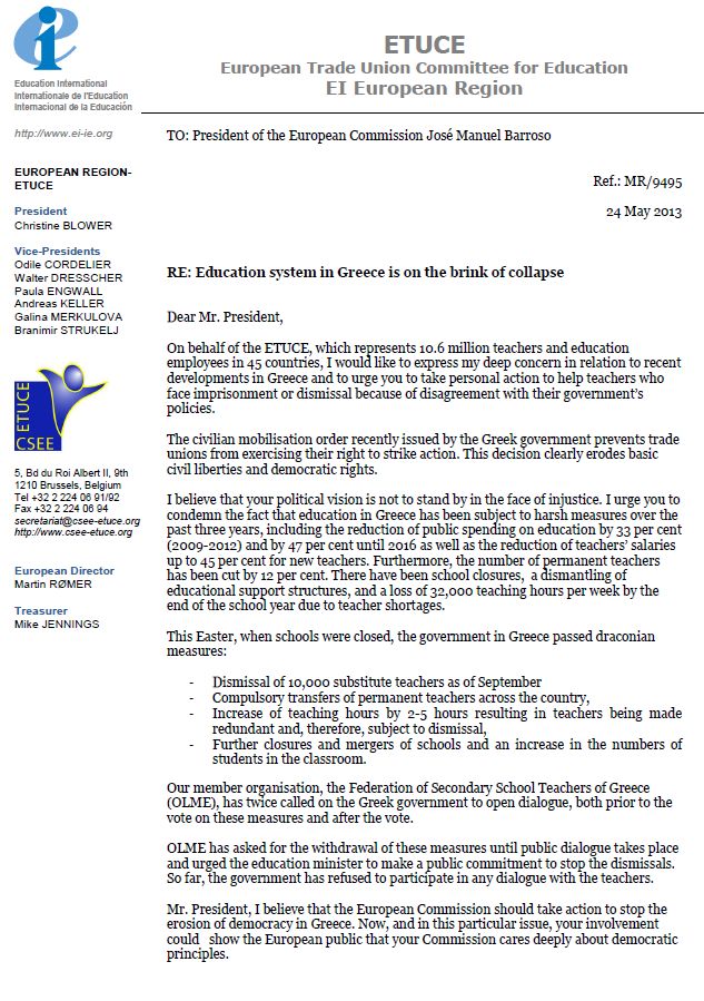 Εξ’ ονόματος της ETUCE, που εκπροσωπεί 10.6 εκατομμύρια εκπαιδευτικούς και εργαζόμενους στην εκπαίδευση σε 45 χώρες, θα επιθυμούσα να εκφράσω τη βαθιά ανησυχία μου σε σχέση με τις πρόσφατες εξελίξεις στην Ελλάδα και να σας ενθαρρύνω να αναλάβετε προσωπικά δράση ώστε να βοηθήσετε τους εκπαιδευτικούς που αντιμετωπίζουν τη φυλάκιση ή την απόλυση λόγω της διαφωνίας με τις πολιτικές της κυβέρνησής τους.