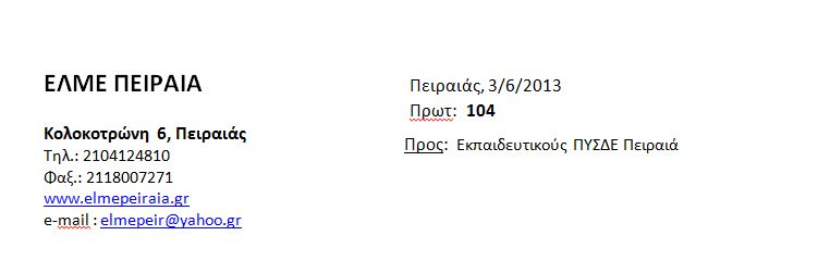 Το Δ.Σ. της ΕΛΜΕ Πειραιά καλεί όλους τους συναδέλφους σε μαζική παράσταση διαμαρτυρίας στα γραφεία της Διεύθυνσης ΔΕ, την Τετάρτη 5/6 στις 12.30 μ.μ. για να απαιτήσουμε: