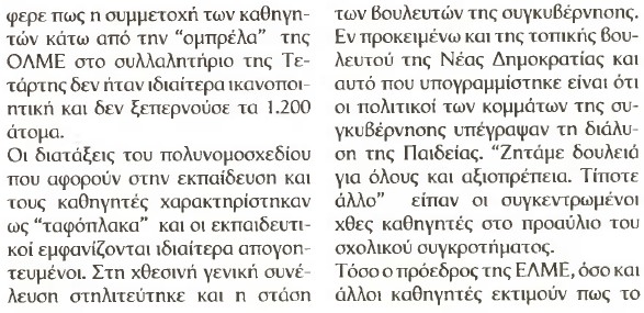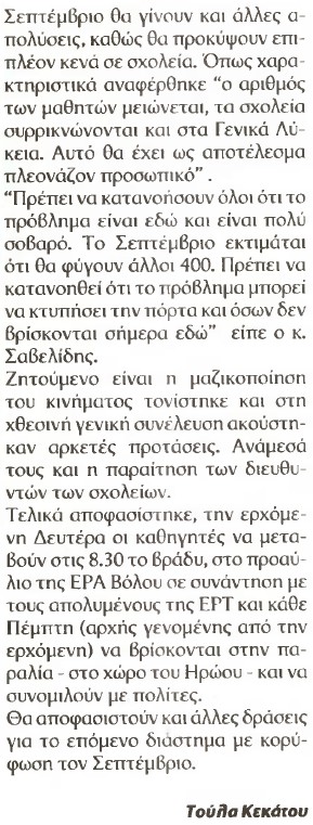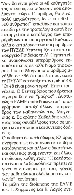 Εντονος είναι ο προβληματισμός και η αγωνία των καθηγητών της Μαγνησίας για το μέλλον τους μετά και την ψήφιση του πολυνομοσχεδίου και ειδικά της τροπολογίας που αναφέρεται στους υπεράριθμους. Αυτό που τονίστηκε μάλιστα με έμφαση στη χθεσινή έκτακτη γενική συνέλευση των καθηγητών στο προαύλιο του 3ου Γυμνασίου Βόλου ήταν πως το ερχόμενο Σεπτέμβριο θα έρθουν και άλλες απολύσεις.