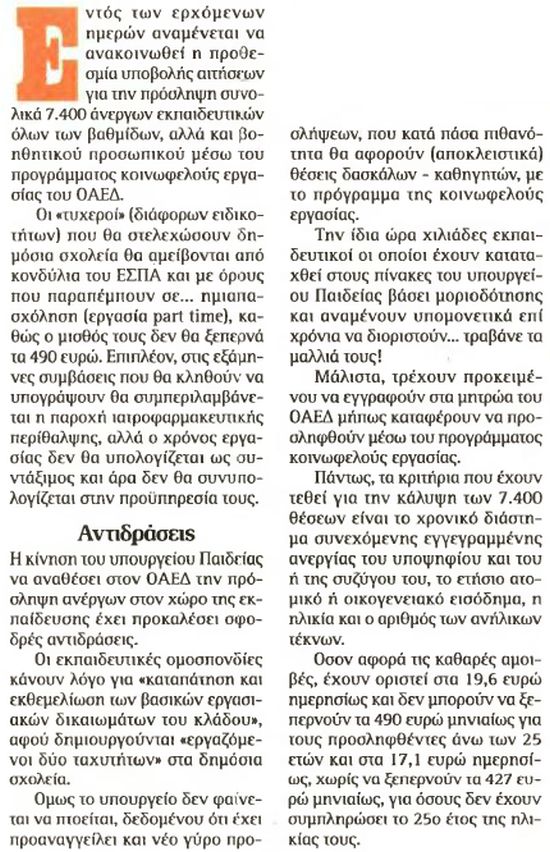 Εξάμηνες συμβάσεις μέσω ΕΣΠΑ, με περίθαλψη και μισθό στα 490 € το μήνα Εύη Πανταζοπούλου