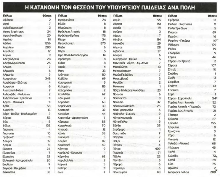 Όσο για τις πόλεις όπου σημειώνονται οι ανάγκες του υπουργείου, ανέρχονται σε πάνω από 158, μεταξύ των οποίων η Αθήνα, όπου καταγράφηκαν 1.356 κενές οργανικές θέσεις, η Θεσσαλονίκη με 870, η Πάτρα με 409, το Μαρούσι με 348, το Αιγάλεω με 280, το Ρέθυμνο με 199 και το Ηράκλειο Κρήτης με 175 θέσεις.